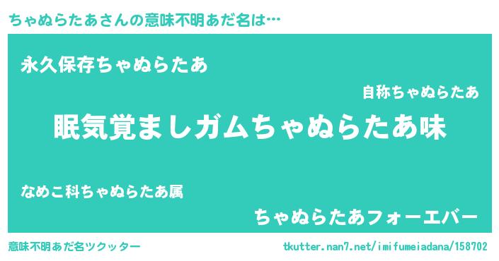 | ヘコむあだ名 | 『ちゃぬらたあ(遠い目)』『豆乳』 |