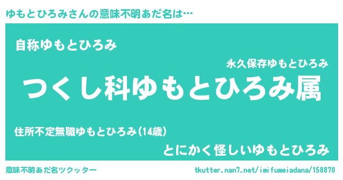| ヒーロー風カッコイイあだ名 | 『最強戦士ユモトヒロミ』『黄金騎士ユモ』 |