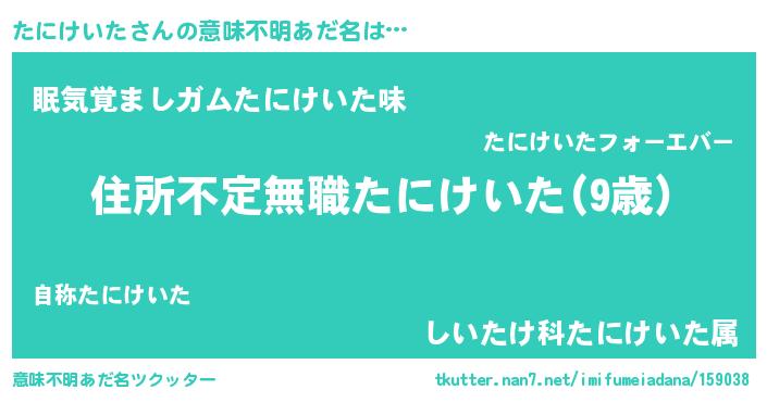 | 男性向けラノベタイトル風あだ名 | 『魔弾の王とたにけいた』 |