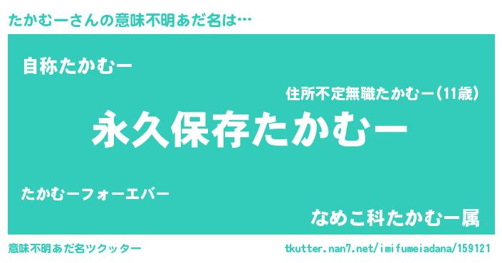 | 男性向けラノベタイトル風あだ名 | 『たかむーという概念が存在しない退屈な世界 』 |