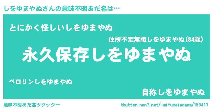 | 男性向けラノベタイトル風あだ名 | 『しをゆまやぬという概念が存在しない退屈な世界 』 |