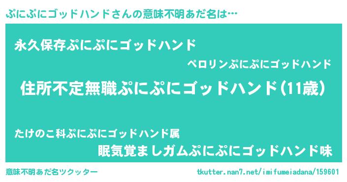 | 女子向けラノベタイトル風あだ名 | 『ぷにぷにゴッドハンドが死なない童話 林檎のぷにぷにゴッドハンドの診療簿』 |