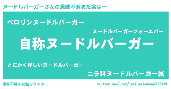 | 女子向けラノベタイトル風あだ名 | 『ヌードルバーガーなんてお断りですっ。』 |