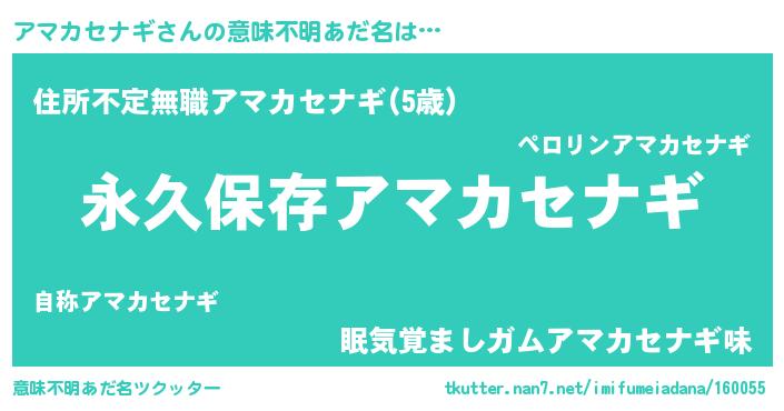 | 男性向けラノベタイトル風あだ名 | 『アマカセナギという概念が存在しない退屈な世界 』 |