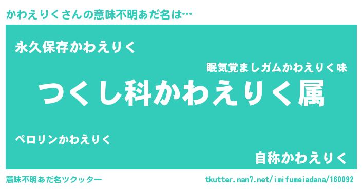 | 胡散臭い通販商品みたいなあだ名 | 『前代未聞の健康食品…その名も「かわえりく」』 |