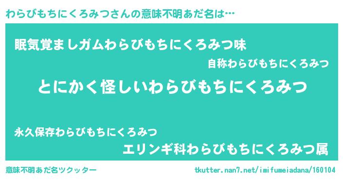 | 欧米人風あだ名 | 『ウサインわらびもちにくろみつ』 |