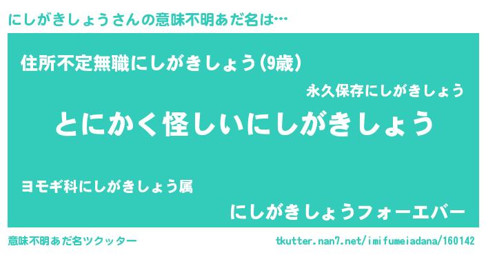 | 男性向けラノベタイトル風あだ名 | 『にしがきしょうの嫁は女の子じゃないと思った?』 |