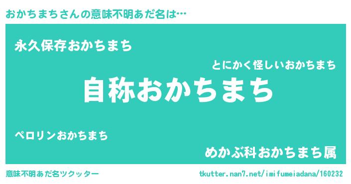 | 男性向けラノベタイトル風あだ名 | 『Re:おかちまちから始める異世界生活』 |