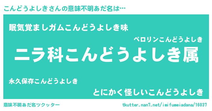 | 男性向けラノベタイトル風あだ名 | 『こんどうよしき~年齢イコール彼女いない歴の魔法使い~』 |