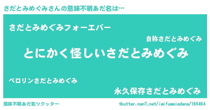 | 男性向けラノベタイトル風あだ名 | 『さだとみめぐみの嫁は女の子じゃないと思った?』 |