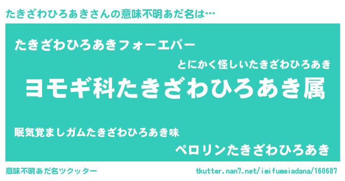| 男性向けラノベタイトル風あだ名 | 『たきざわひろあき~年齢イコール彼女いない歴の魔法使い~』 |