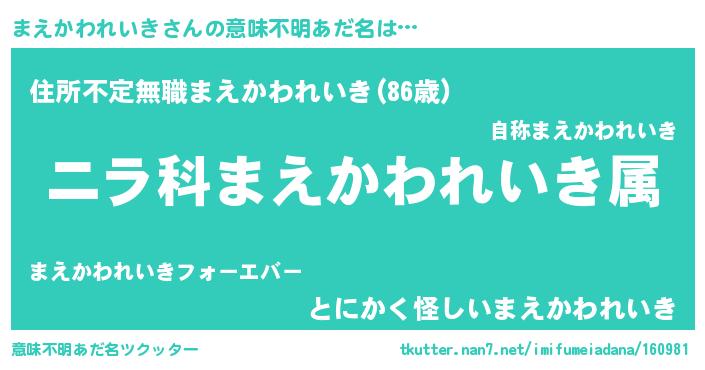| 男性向けラノベタイトル風あだ名 | 『まえかわれいき~年齢イコール彼女いない歴の魔法使い~』 |