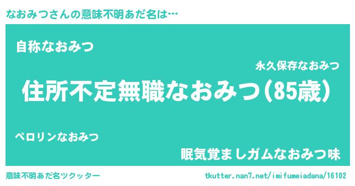 | 女子向けラノベタイトル風あだ名 | 『乙女ゲームの破滅フラグしかない悪役なおみつに転生してしまった…』 |