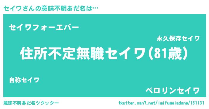 | ヒーロー風カッコイイあだ名 | 『仮面セイダー』『ウルトラセイワマン』 |