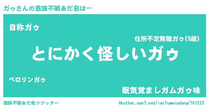 | 女子向けラノベタイトル風あだ名 | 『ガゥは平凡を望む』『闇のガゥ』 |