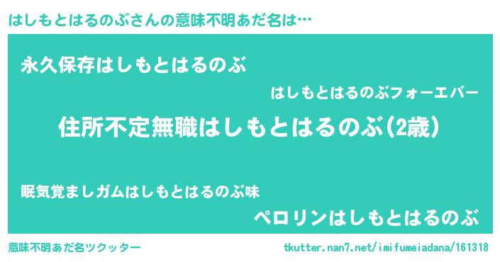 | ヘコむあだ名 | 『はしもとはるのぶ(小並感)』『はしにー』 |