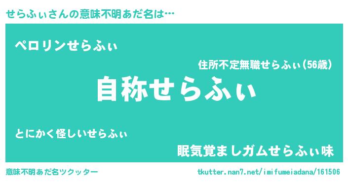 | 男性向けラノベタイトル風あだ名 | 『せらふぃに滅ぼされるだけの簡単なお仕事です』 |