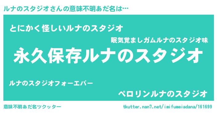 | 男性向けラノベタイトル風あだ名 | 『ルナのスタジオという概念が存在しない退屈な世界 』 |