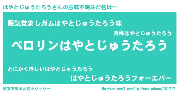 | 男性向けラノベタイトル風あだ名 | 『はやとじゅうたろうの憂鬱』 |