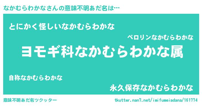 | 男性向けラノベタイトル風あだ名 | 『なかむらわかな~年齢イコール彼女いない歴の魔法使い~』 |
