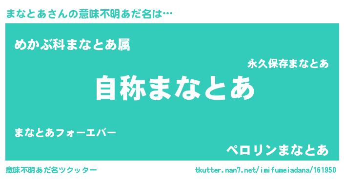 | 男性向けラノベタイトル風あだ名 | 『Re:まなとあから始める異世界生活』 |