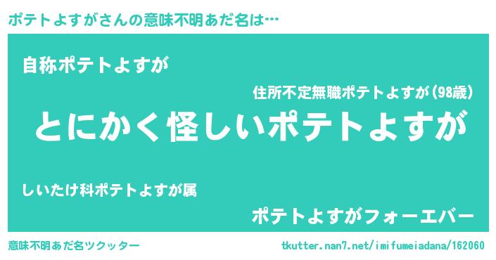 | 男性向けラノベタイトル風あだ名 | 『ポテトよすがの嫁は女の子じゃないと思った?』 |