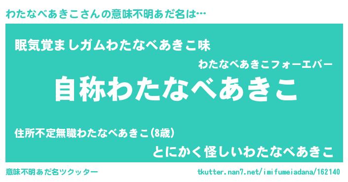 | 男性向けラノベタイトル風あだ名 | 『Re:わたなべあきこから始める異世界生活』 |