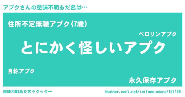 | 男性向けラノベタイトル風あだ名 | 『アプクの嫁は女の子じゃないと思った?』 |
