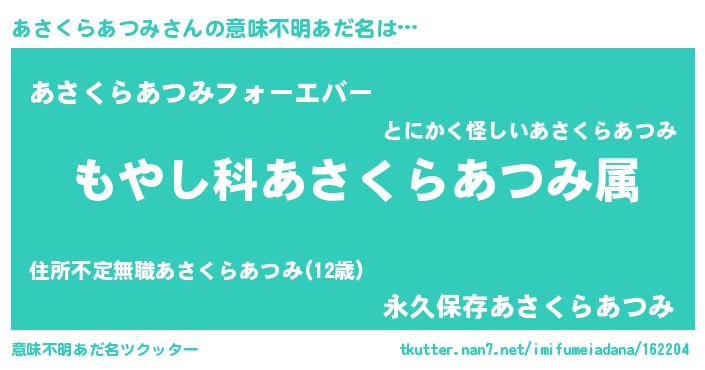 | 女子向けラノベタイトル風あだ名 | 『あさくらあつみの玉の輿計画!』 |