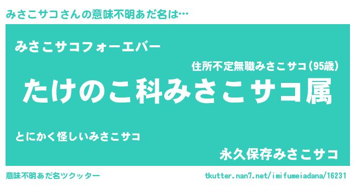 | 男性向けラノベタイトル風あだ名 | 『転生したらみさこサコだった件』 |