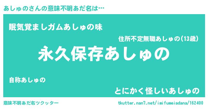 ヘコむあだ名 | 『あしゅの(遠い目)』『あしぷりん』 |