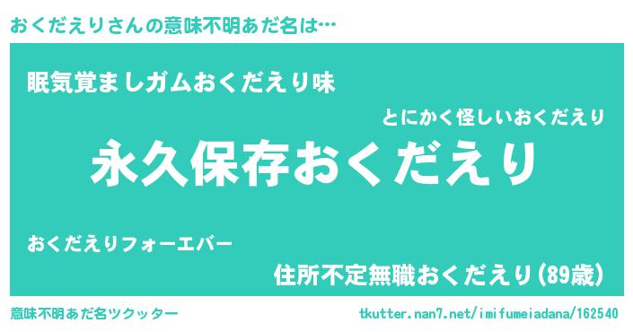 | 男性向けラノベタイトル風あだ名 | 『おくだえりという概念が存在しない退屈な世界 』 |