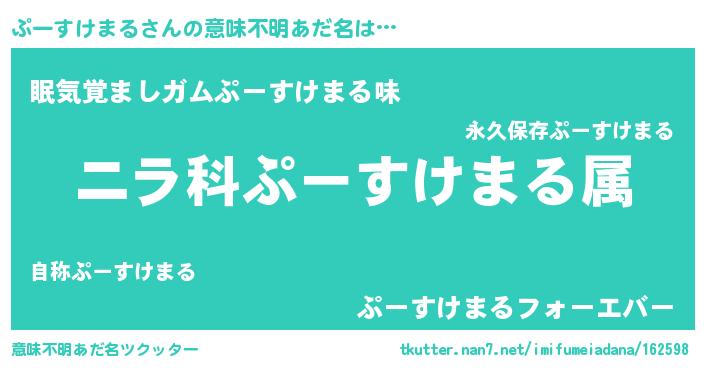 | 男性向けラノベタイトル風あだ名 | 『ぷーすけまる~年齢イコール彼女いない歴の魔法使い~』 |