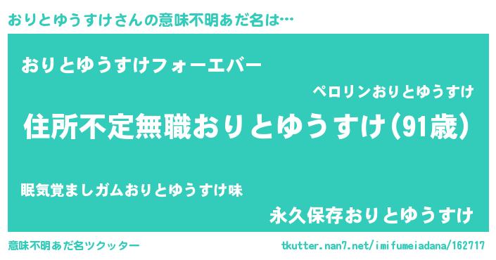 | 男性向けラノベタイトル風あだ名 | 『この素晴らしい世界におりとゆうすけを!』 |