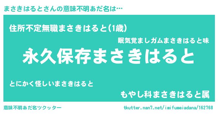 | 男性向けラノベタイトル風あだ名 | 『まさきはるとという概念が存在しない退屈な世界 』 |