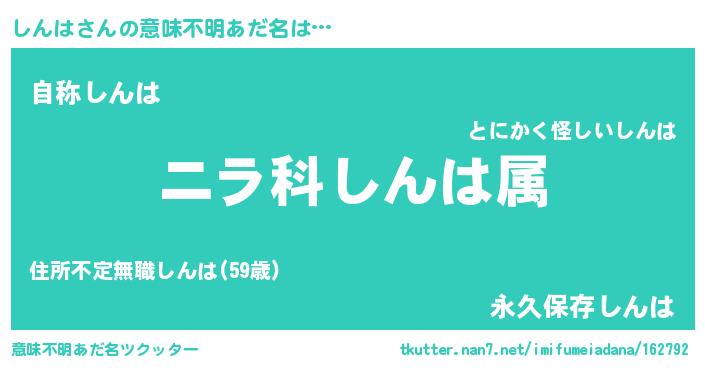 | 男性向けラノベタイトル風あだ名 | 『しんは~年齢イコール彼女いない歴の魔法使い~』 |