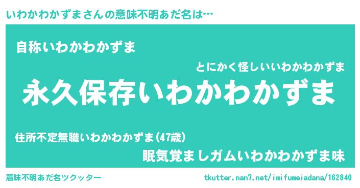 | 男性向けラノベタイトル風あだ名 | 『いわかわかずまという概念が存在しない退屈な世界 』 |