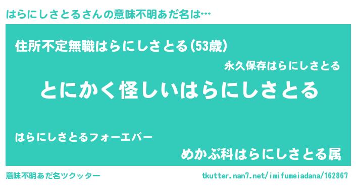 | 男性向けラノベタイトル風あだ名 | 『はらにしさとるの嫁は女の子じゃないと思った?』 |
