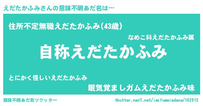 | 男性向けラノベタイトル風あだ名 | 『Re:えだたかふみから始める異世界生活』 |