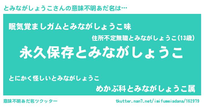 | 男性向けラノベタイトル風あだ名 | 『とみながしょうこという概念が存在しない退屈な世界 』 |