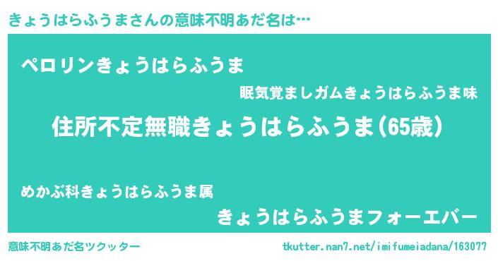 | 欧米人風あだ名 | 『アンジェラ・きょうはらふうま』 |