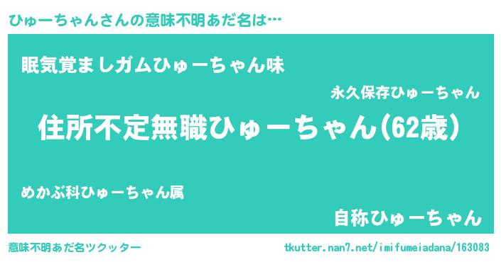 | 男性向けラノベタイトル風あだ名 | 『この素晴らしい世界にひゅーちゃんを!』 |