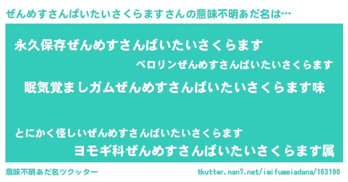 | ヘコむあだ名 | 『ぜんめすさんばいたいさくらます(笑)』 |