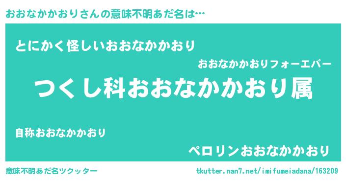 | 男性向けラノベタイトル風あだ名 | 『おおなかかおり~年齢イコール彼女いない歴の魔法使い~』 |