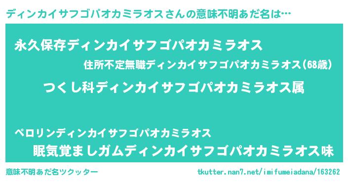 | ヘコむあだ名 | 『ディンカイサフゴパオカミラオス(小並感)』 |