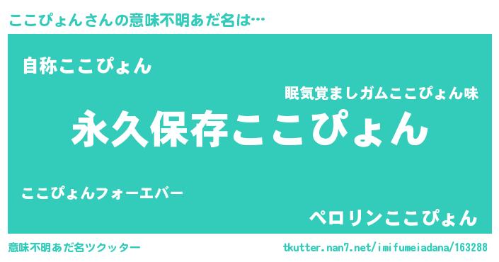 | 男性向けラノベタイトル風あだ名 | 『ここぴょんという概念が存在しない退屈な世界 』 |
