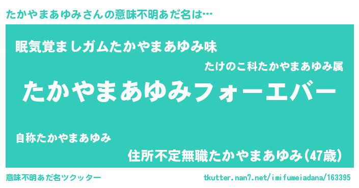 | 肩書あだ名 | 『たかやまあゆみ国家主席』 |