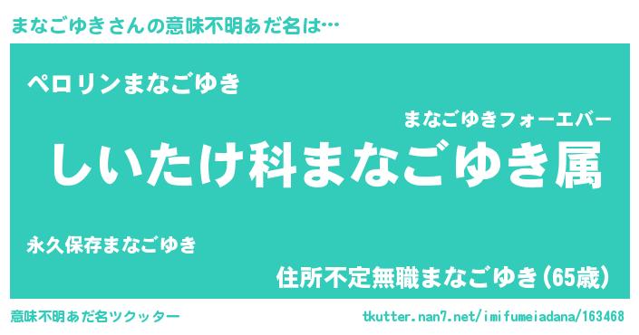 | 胡散臭い通販商品みたいなあだ名 | 『必ず成功するブレスレット…その名も「まなごゆき」』 |