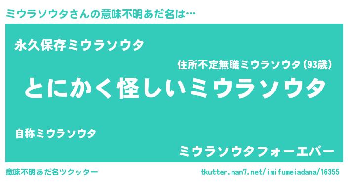 | 男性向けラノベタイトル風あだ名 | 『ミウラソウタの嫁は女の子じゃないと思った?』 |