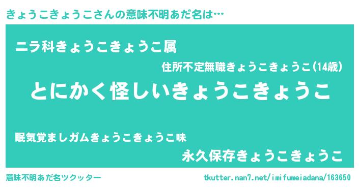 | 胡散臭い通販商品みたいなあだ名 | 『信頼と実績のサプリメント…その名も「きょうこきょうこ」』 |